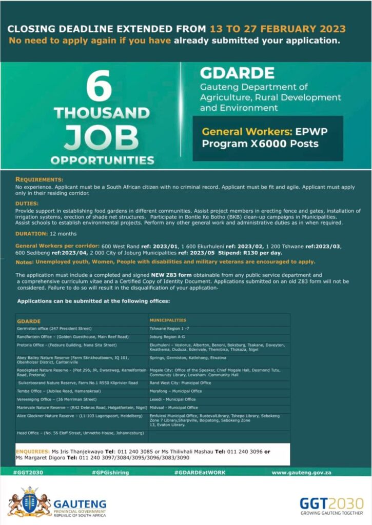 Well, here’s some exciting news for you! The Gauteng Department of Agriculture, Rural Development, and Environment (GDARDE) is looking for General Workers to join their EPWP Program.