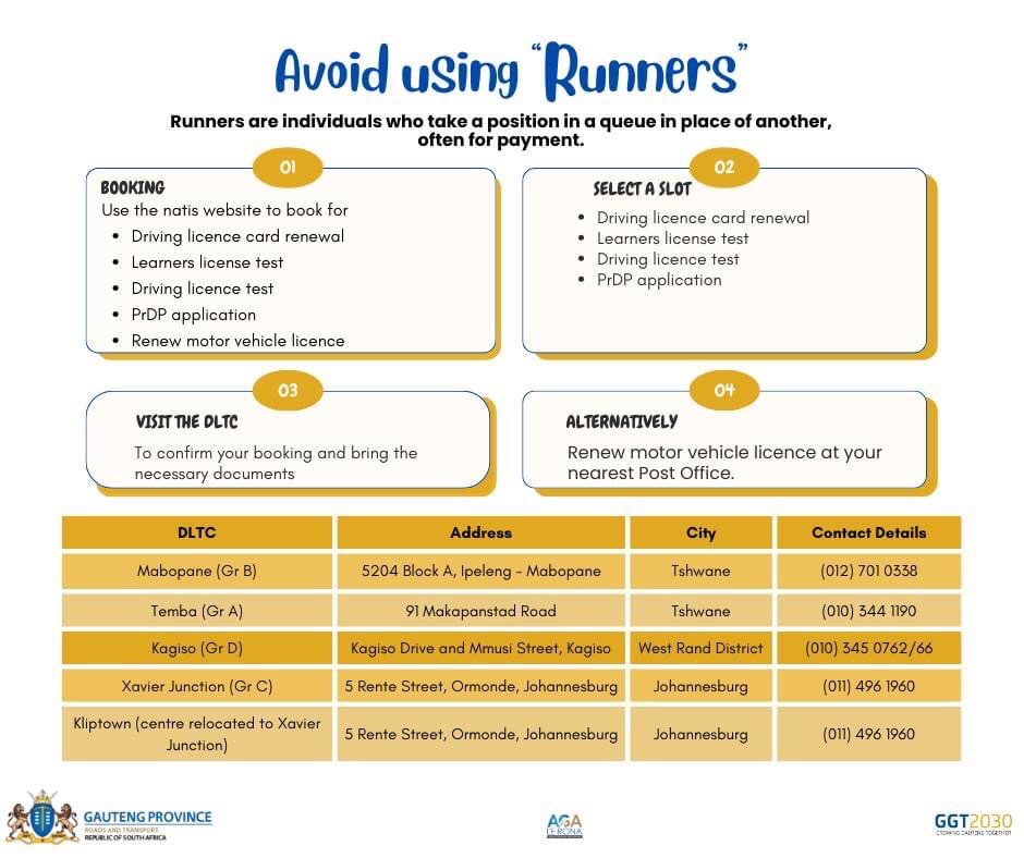 The Gauteng Department of Roads and Transport has urged prospective motorists to not use the services of runners when trying to obtain their licenses.