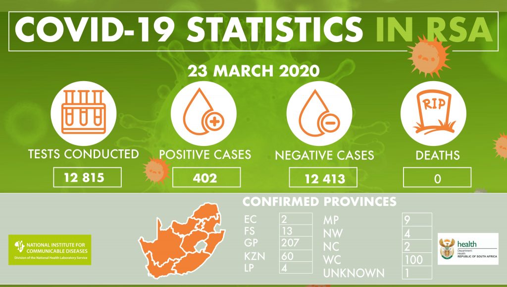 South Africa has 402 confirmed cases of COVID-19, a shocking increase of 128 from Sunday’s announcement.