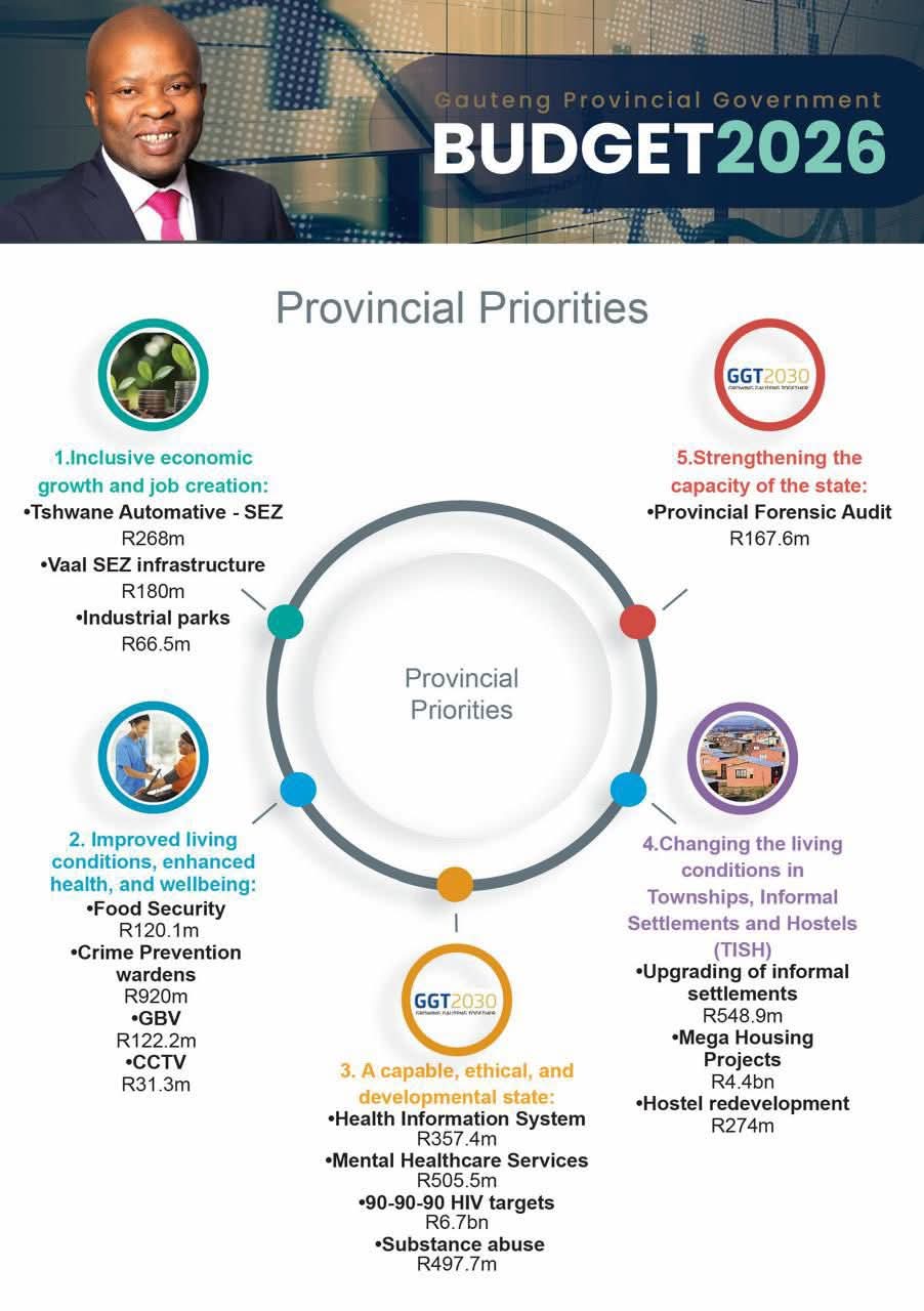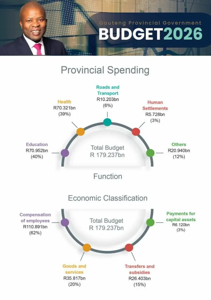 The province entered the 2025/26 financial year with a main budget of R172.3 billion, which was later adjusted to R175.6 billion and adopted by the Gauteng Provincial Legislature.