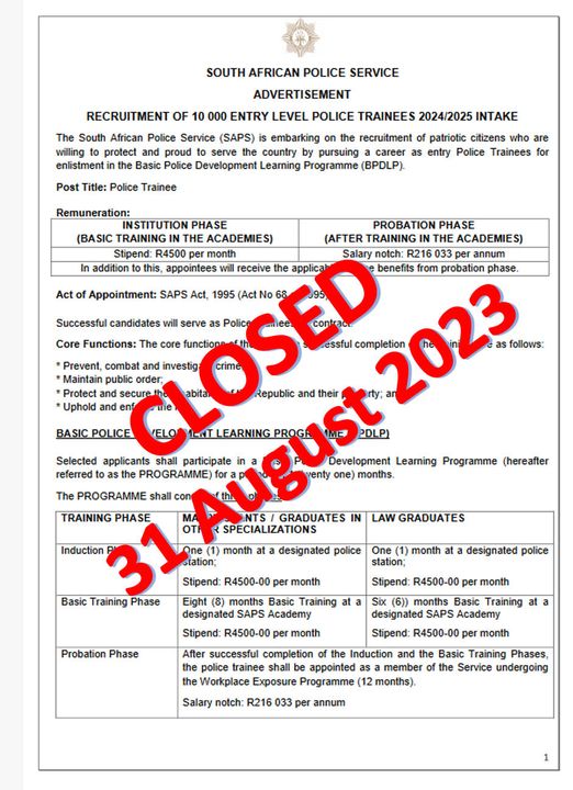 The South African Police Service (SAPS) has received numerous enquiries regarding an old advertisement that is currently circulating on social media platforms on the recruitment of 10 000 entry level police trainees for the 2024/2025 intake.