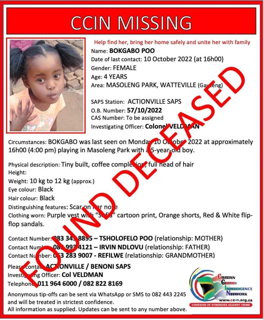 The little girl from Wattville in the City of Ekurhuleni was reported missing a week earlier on, October 10.